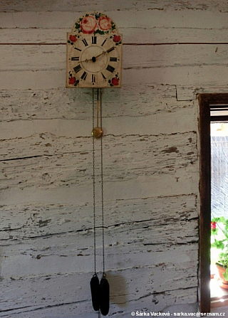 Z důvodu co nejmenších ztrát tepla se domy stavěly s nízkými stropy, malými okny. Interiérové vybavení se na první pohled odlišuje od klasické podoby muzea. Procházím malými útulnými pokoji. Žádné provazy se zákazem vstupu, žádné skleněné vitríny ani popisky. Vstupuju do malého vejmínku, kde se nachází postel s péřovou peřinou. Kuchyni šlechtí obrovská zelená kamna s pecí, na které spávalo až 13 dětí. Pochopitelně nesmí chybět kozlíkový stůl, u kterého se scházela celá rodina. Byl to nejcennější kus nábytku z celé chaloupky. Když vypukl požár, tak se vždy první musel vynést tento stůl.