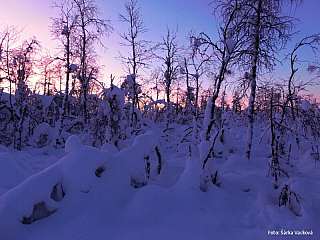 Jedu s Filipem. Nejdříve si sedám do saní a přehazuji přes sebe sobí kožešinu. Filip stojí za mnou na gumových podložkách a pohybem těla velí psům na rozjezd. Vyrážíme na zasněžené pláně, mezi lesy, po udusaném i rozprášeném sněhu a necháváme se unášet stmívající se oblohou, která hraje duhovými barvami. V půlce cesty se měníme. Filip dává povel psům, kteří okamžitě zastavují. Stavím se na sáně, nahýbám se lehce doprava a huskies reagují na sekundu přesně a odbočí doprava. Z jízdy je cítit energie, síla, elán, ale i poslušnost a oddanost laponských chundeláčků, kteří neštěkají, ale vyjí. Subarktické podnební pásmo je pro ně rájem a v zapřažení se pohybují ladně a elegantně, ovšem velmi rychle. Užívají si jízdu stejně jako my.