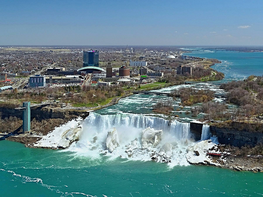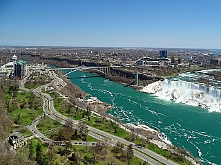 Niagarské vodopády se nachází na rozhraní mezi jezerem Ontario a Erijským jezerem a tvoří přirozenou hranici mezi USA a Kanadou. Jejich výška činí 52 metrů. Jsou to tři sousedící vodopády na řece Niagara. Vodopády na kanadské straně se nazývají Horseshoe falls. U vodopádů se nachází město s názvem Niagara Falls, odtud si vodopády můžete prohlédnout ze dvou vyhlídkových věží - Skylon Tower a Minolta Tower. Skylon Tower patří ke kasinu a je vysoká 236 metrů, nahoru se dostanete výtahem za necelou minutu. Začala se stavět v roce 196 a byla otevřena 6. října 1965, přičemž její cena se vyšplhala na 7 milionů dolarů. Minolta Tower je vysoká 99 metrů a byla otevřena v roce 1962. Na kanadském nábřeží si vodopády můžete prohlédnout kromě jedné ze dvou věží také z Queen Victoria Park. Dá se sem dostat také lanovkou, která vás zaveze zhruba 5km pod vodopád.
